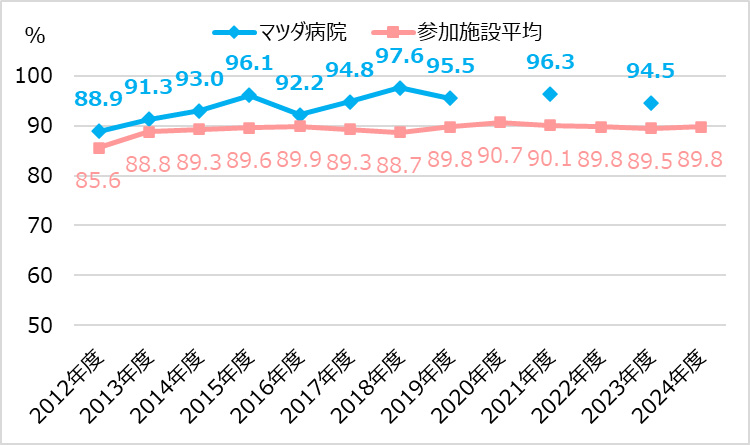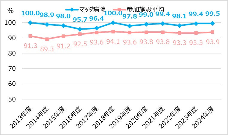 - 特定術式における手術開始1時間以内の予防的抗菌薬投与率