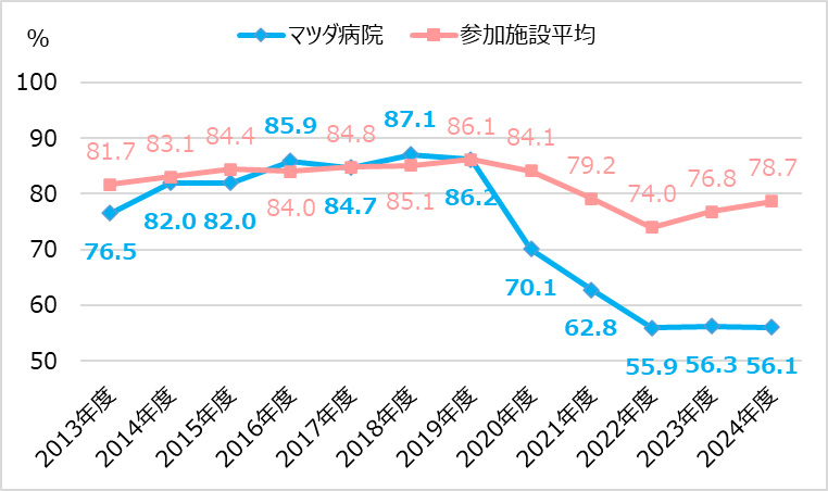 - 薬剤管理指導実施割合(病棟薬剤業務実施加算の有る医療機関)