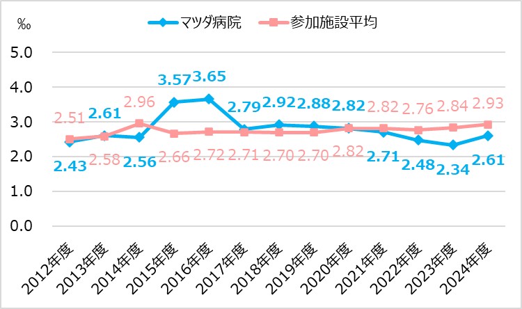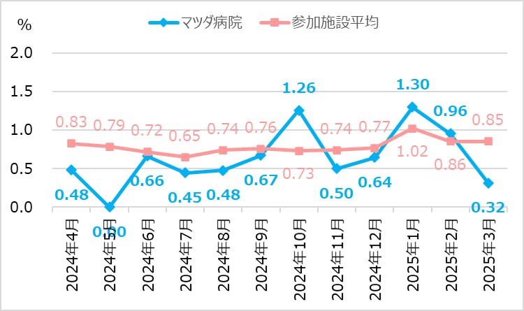 - 入院患者の転倒・転落による損傷発生率(損傷レベル4以上)