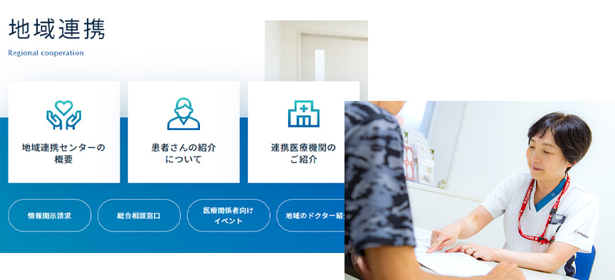 地域連携に関する情報をわかりやすく、そして内容を充実させました。医療機関からの紹介の方法、入院から退院までの支援の内容、連携医療機関の紹介、イベントの紹介などを掲載しています。