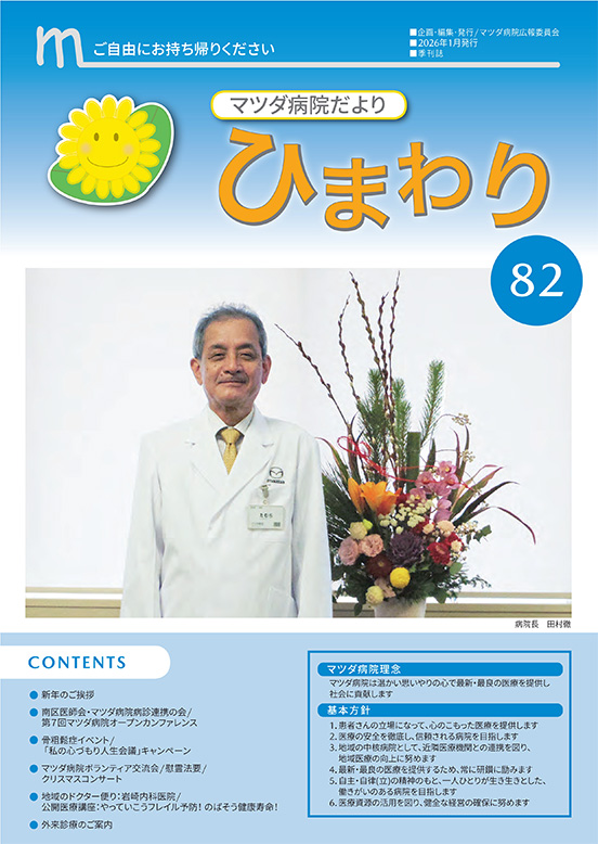ひまわり vol.82(2026年1月) 主な記事 新年のご挨拶南区医師会・マツダ病院病診連携の会/ 第7回マツダ病院オープンカンファレンス骨粗鬆症イベント/私の心づもり人生会議」キャンペーンマツダ病院ボランティア交流会/慰霊法要/クリスマスコンサート地域のドクター便り:岩崎内科医院/ 公開医療講座:やっていこうフレイル予防!のばそう健康寿命!外来診療のご案内 ひまわり vol.82(2026年1月) (PDF ファイル 5.22MB)