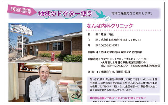 地域のドクター紹介 地域の先生方を紹介します。 (マツダ病院季刊誌『ひまわり』 地域のドクター便り より) ページ内目次 なんば内科クリニック 医療法人社団湧泉会ひまわり歯科 行徳皮ふ科アレルギー科 むかいなだ耳鼻咽喉科・アレルギー科 医療法人健仁会 西村内科医院 おんじ内科クリニック 医療法人 向洋こどもクリニック 医療法人せのがわ 瀬野川病院 医療法人社団石見会 いわさきクリニック 海田よつ葉クリニック 社会福祉法人広島厚生事業協会 府中みくまり病院 藤村医院 医療法人KOC金谷整形外科クリニック 岡原内科皮ふ科クリニック 広島県立広島がん高精度放射線治療センター (HIPRAC) ちえ内科クリニック 鈴川内科クリニック 青崎いぶきクリニック 小山田内科医院 なんば内科クリニック なんば内科クリニック 詳しくはこちら 医療法人社団湧泉会ひまわり歯科 医療法人社団湧泉会ひまわり歯科 詳しくはこちら 行徳皮ふ科アレルギー科 行徳皮ふ科アレルギー科 詳しくはこちら むかいなだ耳鼻咽喉科・アレルギー科 むかいなだ耳鼻咽喉科・アレルギー科 詳しくはこちら 医療法人健仁会 西村内科医院 医療法人健仁会 西村内科医院 詳しくはこちら おんじ内科クリニック おんじ内科クリニック 詳しくはこちら 医療法人 向洋こどもクリニック 医療法人 向洋こどもクリニック 詳しくはこちら 医療法人せのがわ 瀬野川病院 医療法人せのがわ 瀬野川病院 詳しくはこちら 医療法人社団石見会 いわさきクリニック 医療法人社団石見会 いわさきクリニック 詳しくはこちら 海田よつ葉クリニック 海田よつ葉クリニック 詳しくはこちら 社会福祉法人広島厚生事業協会 府中みくまり病院 社会福祉法人広島厚生事業協会 府中みくまり病院 詳しくはこちら 藤村医院 藤村医院 詳しくはこちら 医療法人KOC金谷整形外科クリニック 医療法人KOC金谷整形外科クリニック 詳しくはこちら 岡原内科皮ふ科クリニック 岡原内科皮ふ科クリニック 詳しくはこちら 広島県立広島がん高精度放射線治療センター (HIPRAC) 広島県立広島がん高精度放射線治療センター (HIPRAC) 詳しくはこちら ちえ内科クリニック ちえ内科クリニック 詳しくはこちら 鈴川内科クリニック 鈴川内科クリニック 詳しくはこちら 青崎いぶきクリニック 青崎いぶきクリニック 詳しくはこちら 小山田内科医院 小山田内科医院 詳しくはこちら 関連リンク 季刊誌ひまわり
